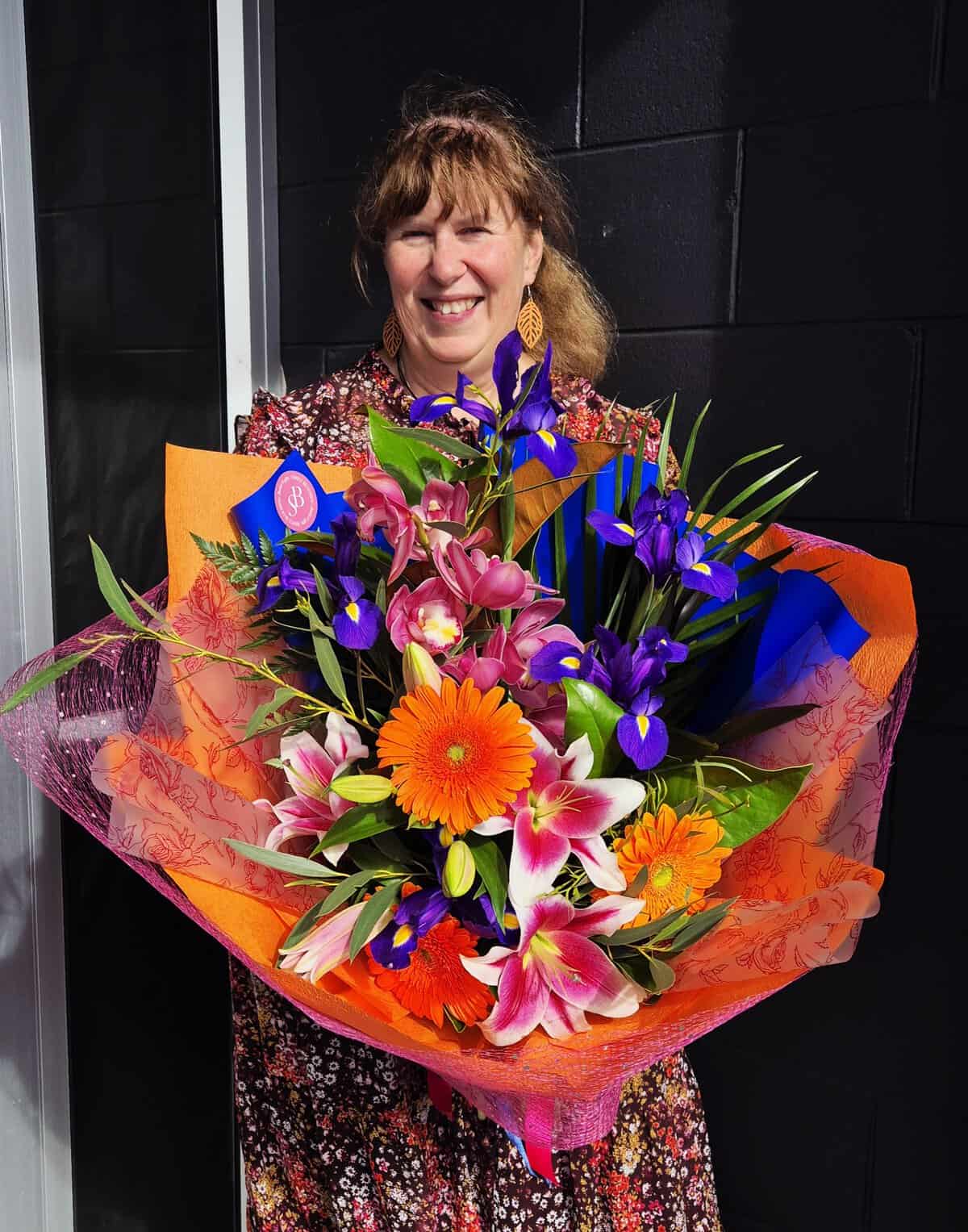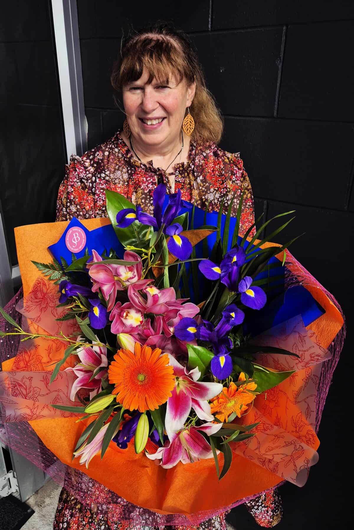 Adding a deeply personal touch, Deb’s children helped her select some of the colours and flowers included in this bouquet, making it a heartfelt reflection of the people who mean the most to her. A stunning mix of irises, bright gerberas, alstroemeria, an orchid and lush lilies come together in a lively, uplifting palette, creating a bouquet full of warmth, joy, and personality.