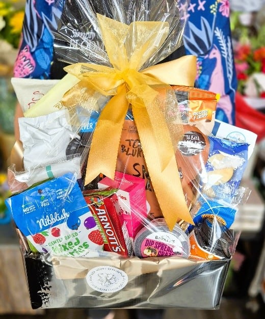 This hamper contains both sweet and savoury food items and may include potato chips, crackers, nuts, chocolate, biscuits, lollies, herbal tea, popcorn, pea snaps, imported food such as, chocolate, biscuits, dried fruit, crackers, sauces, jams, and international foods!