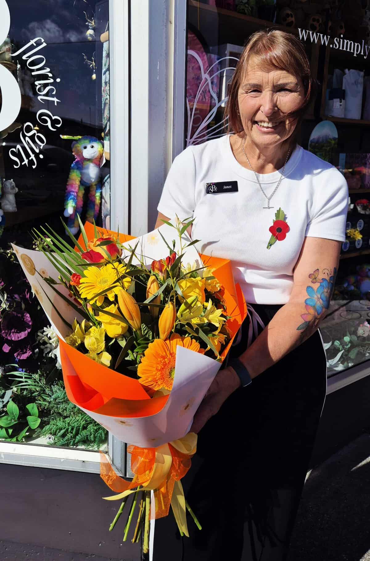 Each flower has been carefully hand selected to represent joy, warmth, and the love she gives so freely. Featuring radiant yellow roses, cheerful gerberas, and seasonal blooms in uplifting tones of yellow and orange, this designed bouquet captures a sense of happiness, positivity, and heartfelt emotion. The striking colour palette symbolises sunshine, strength, and the unwavering support Janet provides to those around her.