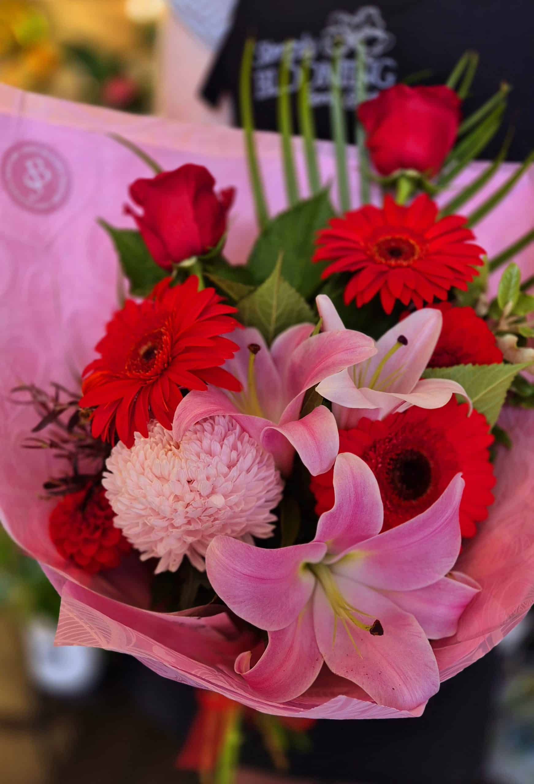 Our florist choice pink and red bouquet of fresh cut flowers is romantic, lush and sultry. Featuring the colours red, pink, and burgundy which are associated with love and passion.